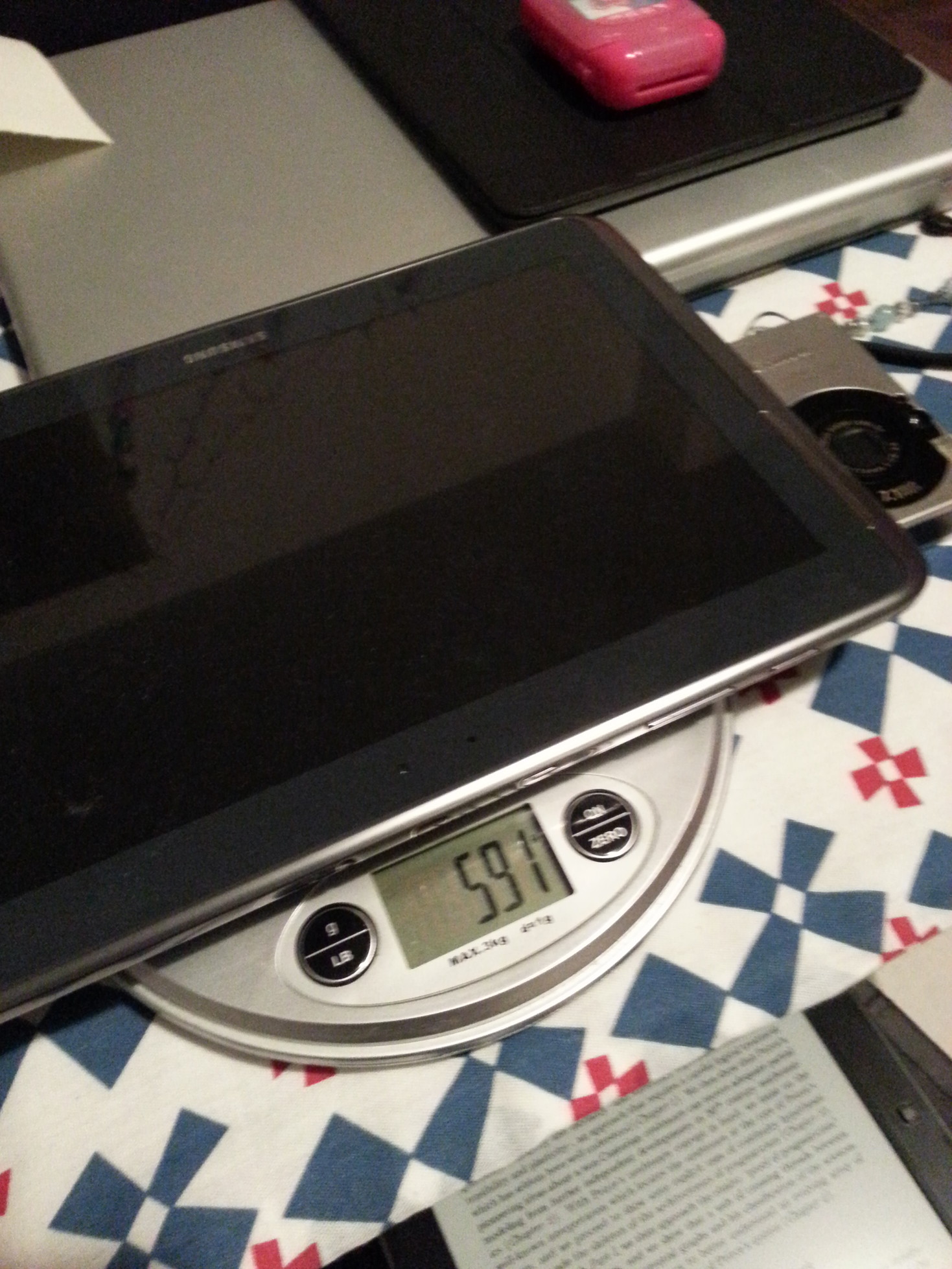 MobileRead Wiki によると、Onyx Boox M96 (Plus)(以下、たんに "M96" と呼ぶ)の重さは 520g ということで、この数値だけ見ると電子書籍リーダーとしてはちょっと重いように感じられます(もっとも、M96 は実質 Android タブレットなので、そう考えると、520g という重さも 9.7 インチタブレットとしてはまったくふつうなのですが)。ただ、じっさいに使用した感覚で言うと、それほど重いとは感じられない。そこで、うちにある各種タブレット、および手ぢかにあった本と M96 の重さをくらべてみました。